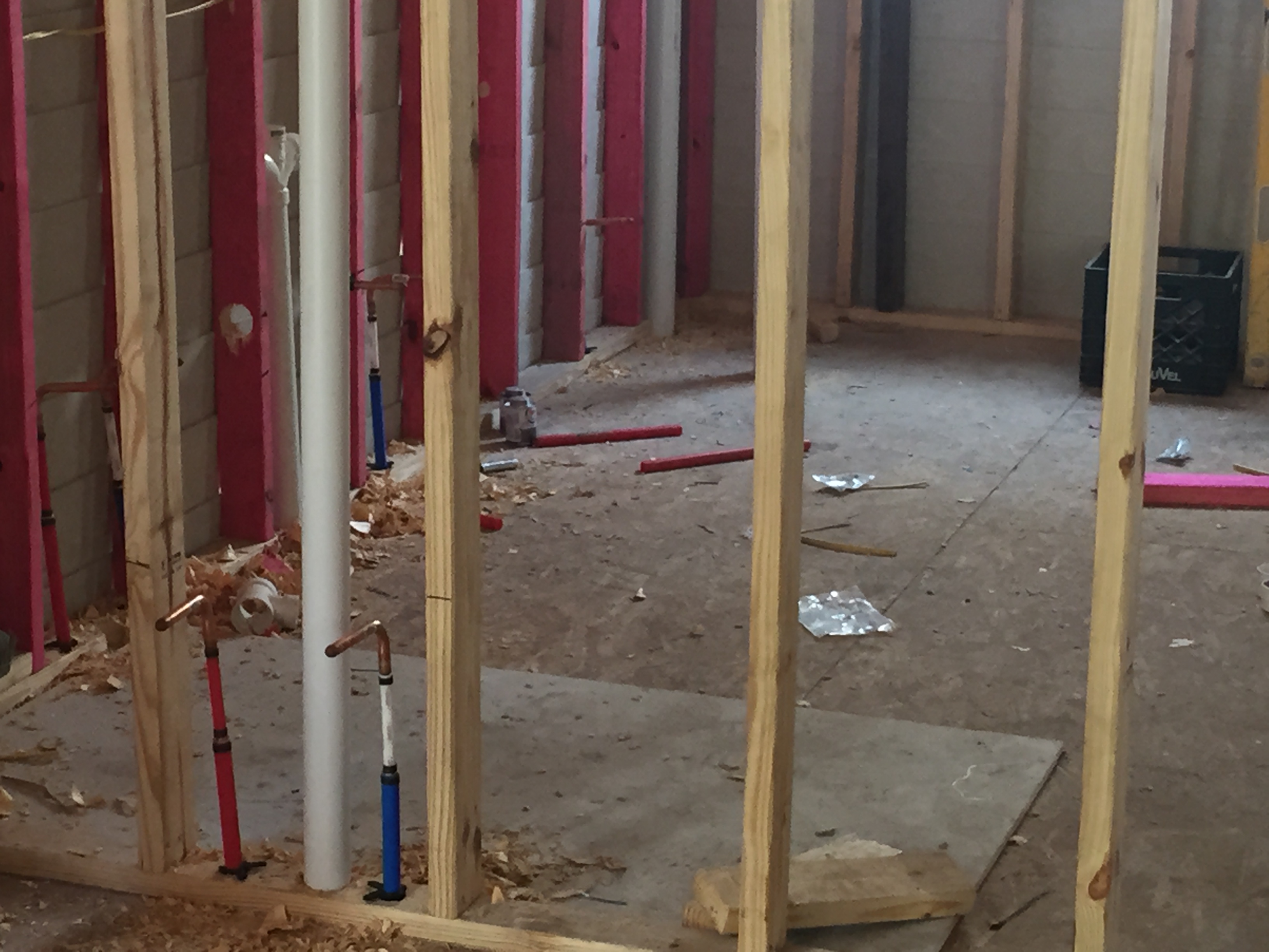 Everything is pretty much buttoned up now. The heat and AC units are installed, the plumbing is roughed in, the electrical is roughed in and we spent most of last week waiting for our cover up inspection. That inspection happened Friday and we are good to go. The guys were working on insulation yesterday (Saturday) but I didn’t make it by for a look. I’ll pop by tomorrow and take a few more photos. In the meantime here are a few from last week, up until we stopped to wait for the inspector.